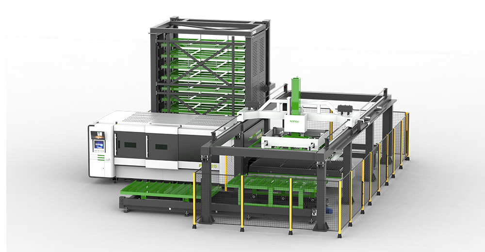 在松谷激光切割機的切割平臺上搭載 HyStore 系列自動上下料及倉儲系統(tǒng),通過軟件控制系統(tǒng)進行串聯(lián)控制,實現(xiàn)無人值守的全自動化智能激光切割生產(chǎn)線;
